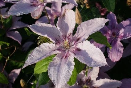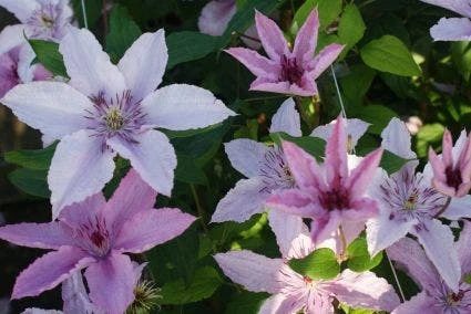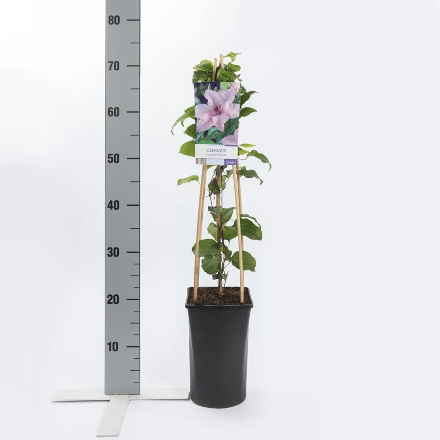 Clematis ‘Hagley Hybrid’ heeft lichtrose/rose bloemen. Bloeit uitbundig van juli t/m september. Bladverliezend.