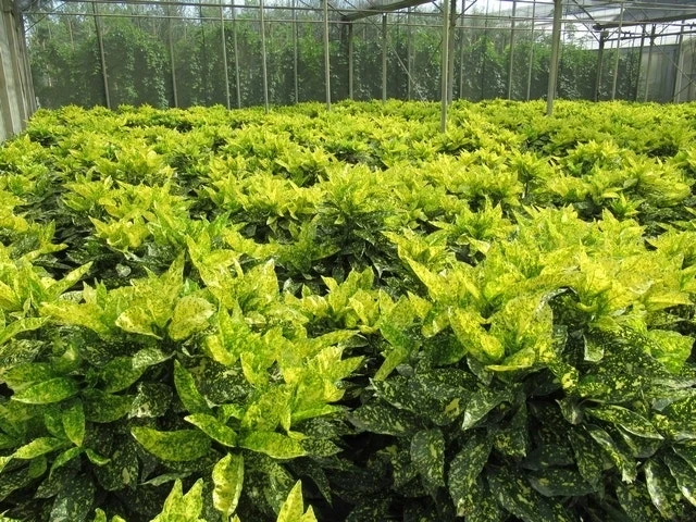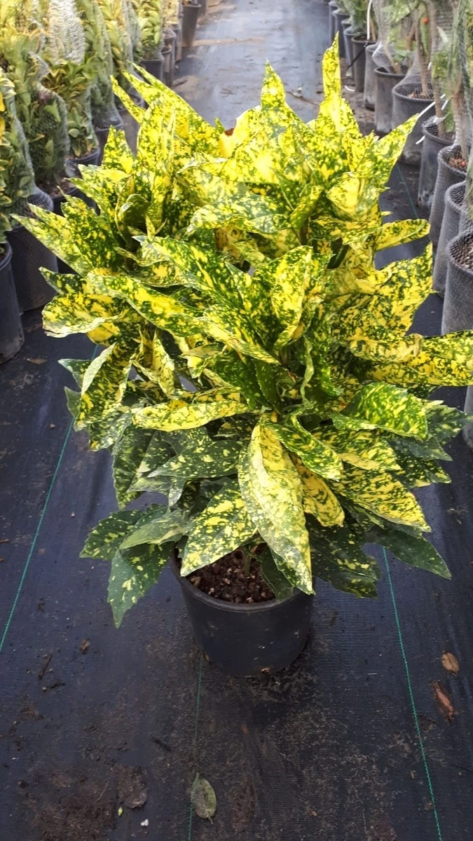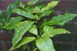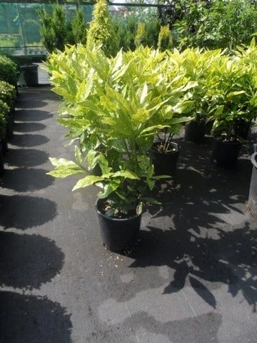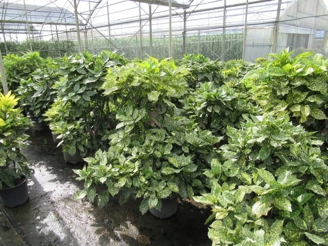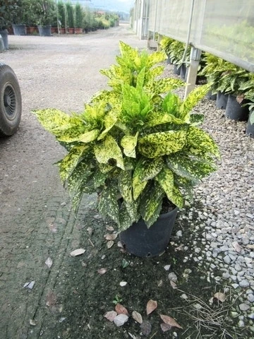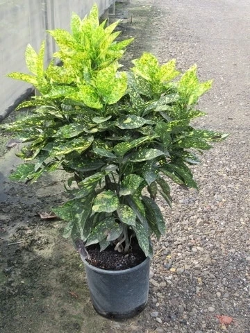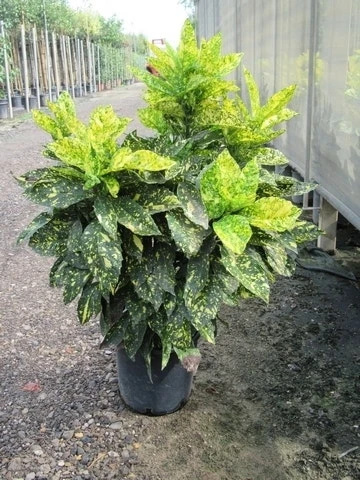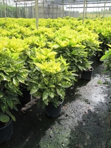 Aucuba japonica ‘Crotonifolia’ heeft groter blad dan de andere varieteiten. Blad is glanzend groen met veel gele plekken. De Aucuba is onderhoudsvrij en behoeft geen snoei.