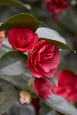 Camellia ‘Lady Campbell’ is een populair vanwege de mooie rode roosvormige bloemen (zo’n 7-10cm in doorsnee).