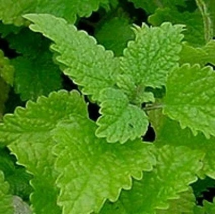 Melissa officinalis (Citroenmelisse) Bossige, sterk geurende kruidenplant. Hoogte circa 70 cm. Wit tot lichtroze bloemen van juli tot september. Aromatisch, naar citroen geurend blad. Zon – halfschaduw. Liefst iets kalkhoudende, voedzame grond.