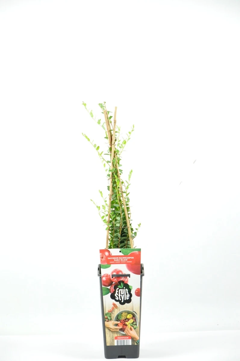 Deze cranberry is een bodem bedekkende plant met dunne takjes en fijne bladeren. Deze plant verlangt een vochtige standplaats. Eventueel is het mogelijk grond vermengen met turfmolm of tuinturf om de zuurgraad (ph) van de grond omlaag te brengen. De Vaccinium Macrorampom ‘Early Black’ geeft rode bessen die in de loop van de zomer verkleuren van groen naar donkerrood. Geeft grote vruchten met een grote opbrengst en goede kwaliteit. De Early Black is het standaardras van de Cranberry’s. De plant hoeft weinig gesnoeid te worden. Bloeitijd: April/mei Rijptijd/pluktijd: Vanaf eind augustus tot begin september