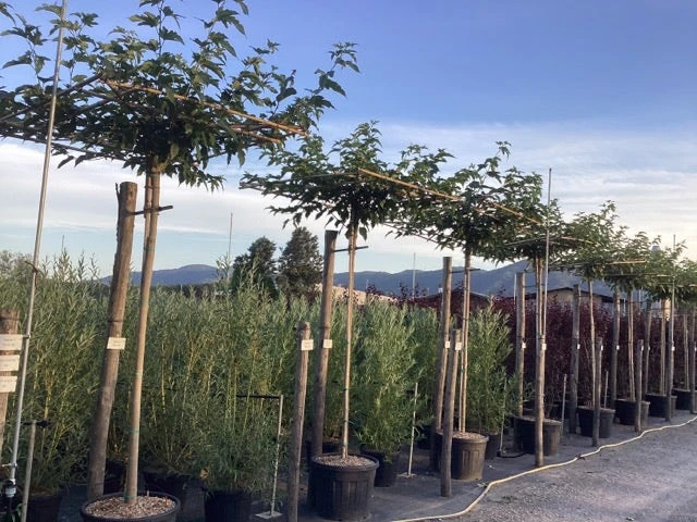 Morus alba ‘Fruitless’ (Witte moerbei) deze moerbei krijgt geen vruchtjes. Een ideale boom voor bijvoorbeeld boven een terras. De vruchtjes van een moerbei geven vlekken op de tegels van het terras. Deze Morus alba ‘Fruitless’ is gekweekt als dakboom.