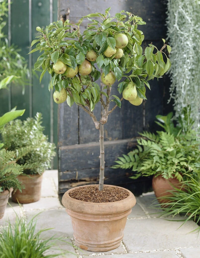 Pyrus communis ‘Mini’, minipeer of dwergpeer blijft kleiner dan gemiddelde andere perenbomen. volwassen boom is 150 cm hoog. past met name goed op terras of balkon zelfbestuivend.