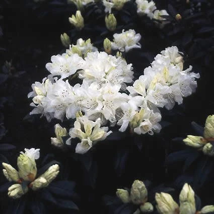 Rhododendron ‘Dora Amateis’ wordt maximaal 80 cm hog en breed. Vanaf mei verschijnen de zuiverwitte bloemen aan de Rhododendron.