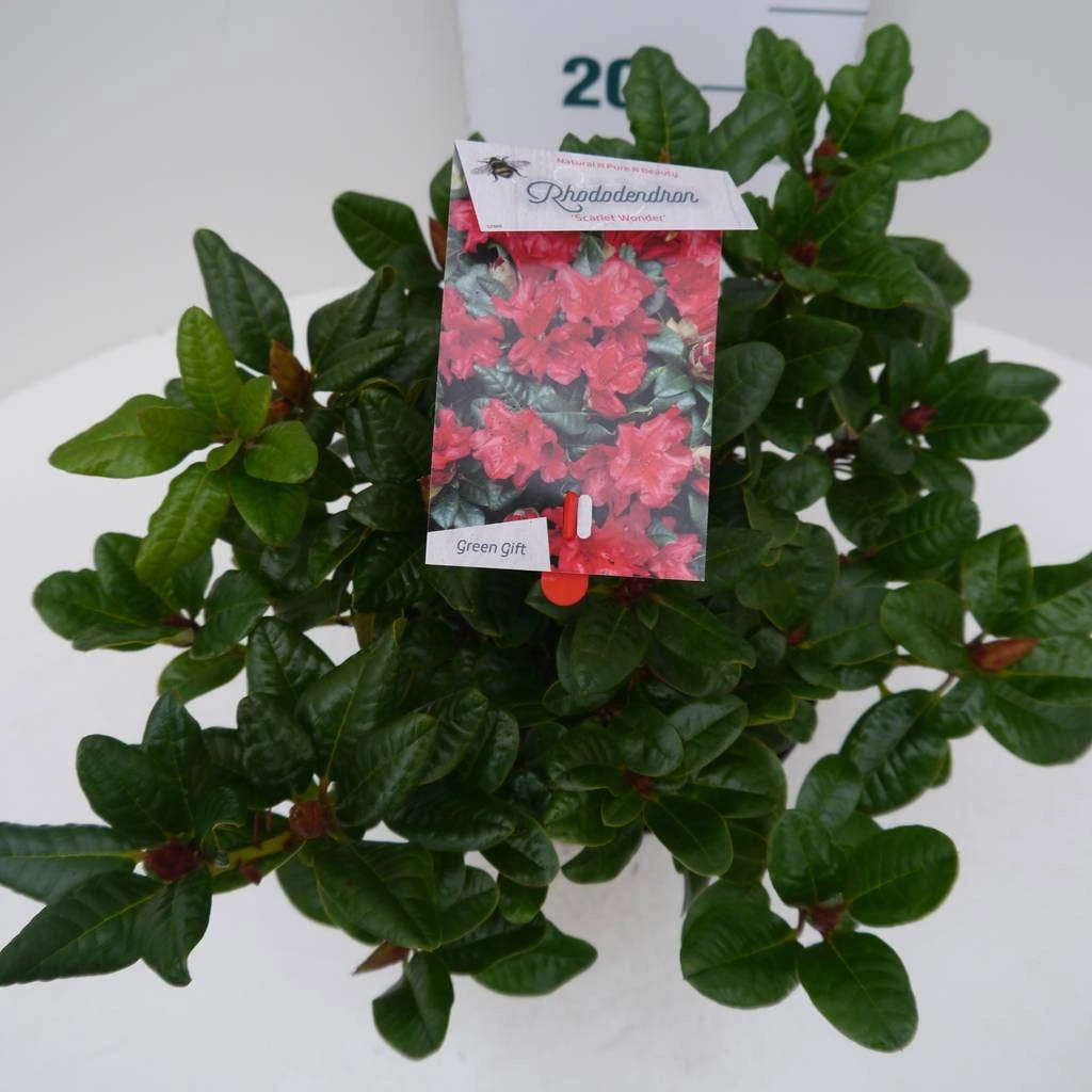 Rhododendron ‘Scarlet Wonder’ is een dwergrhododendron die maximaal 60 cm hoog wordt, maar wel 100cm breed kan worden.