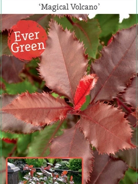 Photinia ‘Magical Volcano’ is een groenblijvende struik waarvan het jonge blad prachtig rood van kleur is. Deze selectie van de glansmispel vertakt zich beter dan de meer bekende ‘Red Robin’, zodat de plant mooier en voller van model wordt. Mooi is ook dat het blad licht golvend is. De plant kan met gemak 175 cm hoog worden en laat zich prima snoeien. Snoeien mag het hele groeiseizoen gebeuren. Zeer geschikt om er een haag van te maken. Graag een halve dag zon of meer. Stelt geen bijzondere eisen aan de grond.