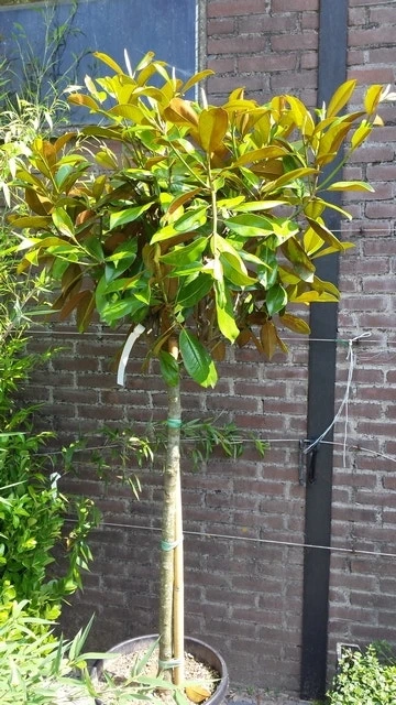 De plant op stam van 90cm is gekweekt in een 30 liter pot. De Magnolia grandiflora op een 100cm stam is gekweekt in een 70 liter grote pot. (zie foto)