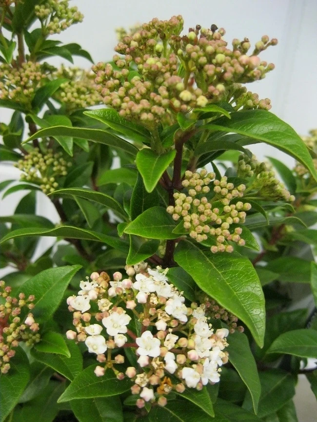 Viburnum tinus wordt ook wel lauriersneeuwbal genoemd.