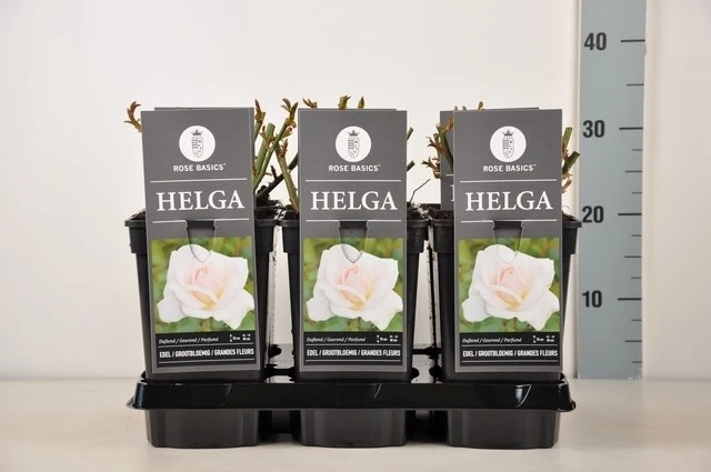 Rosa ‘Helga’ (grootbloemige roos, wit ) is een grootbloemig roos met gevulde witte bloem met zachtroze gloed. De bloem is lichtgeurend en ongeveer 9cm. in diameter. De roos wordt hoog ongeveer 70cm en breed ongeveer 40cm en wordt geleverd in een vierkante pot met inhoud van 3 liter.