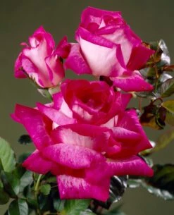 Rosa ‘Rose Gaujard’ is een licht geurende, goed herbloeiende roos met grote gevulde bloemen.