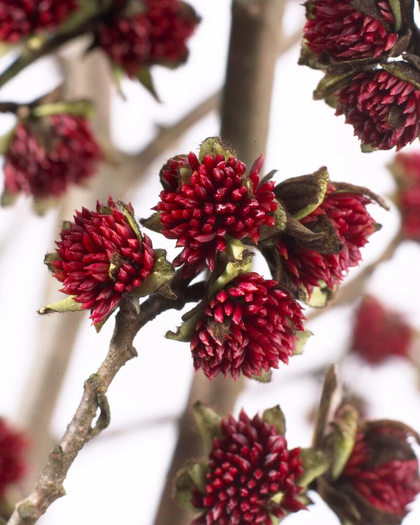 De parrotia bloeit op het kale hout met rode ‘pompons’ van ca 1.5-2 cm, een waar schouwspel: het grillige silhouet van deze soort met een rode gloed door de vele ‘bloemen’.
