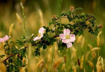 De hondsroos bloeit in juni en juli met 4-6 cm grote, witte of roze bloemen.