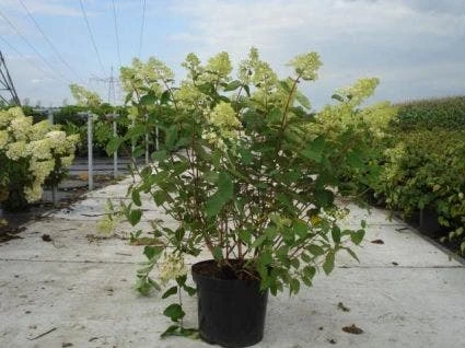 Hydrangea paniculata ‘Grandiflora’ is een pluimhortensia met grote witte bloemen. De witte bloemen verschijnen vanaf juli aan de plant. De bloemen verkleuren later in het seizoen naar purperrood. De bloemen zijn soms te zwaar voor de stengels, dan is ondersteuning aan te bevelen. Wij adviseren alle pluimhortensia’s in het voorjaar kort terug te knippen. Zo houdt u de plant jong en vitaal, Pluimhortensia’s bloeien op het jonge hout.