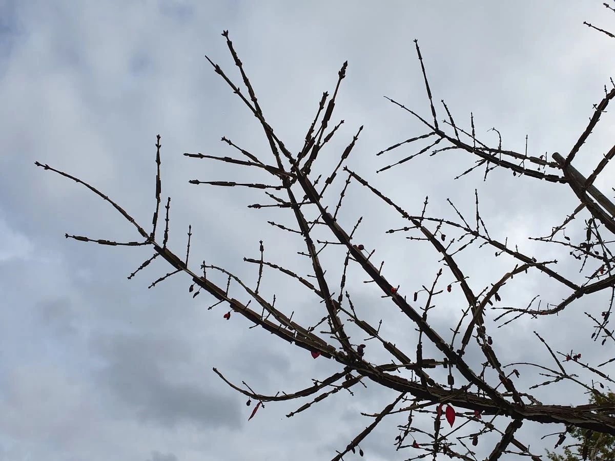 Euonymus alatus (Kardinaalshoed) gekweekt als boom. Doordat deze als boom is gekweekt vallen de mooie kurklijsten op de stam extra op. een mooie sierwaarde bij deze boom die je bij andere bomen niet tegenkomt.