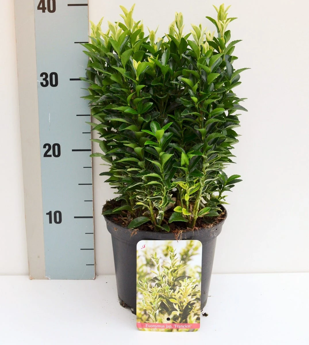De Euonymus japonicus ‘Francien’ wordt maximaal 80cm hoog, maar is op iedere gewenste hoogte te houden door middel van snoeien. Voor een mooie compacte en dichte haag adviseren we om 4/5 planten per strekkende meter te gebruiken.