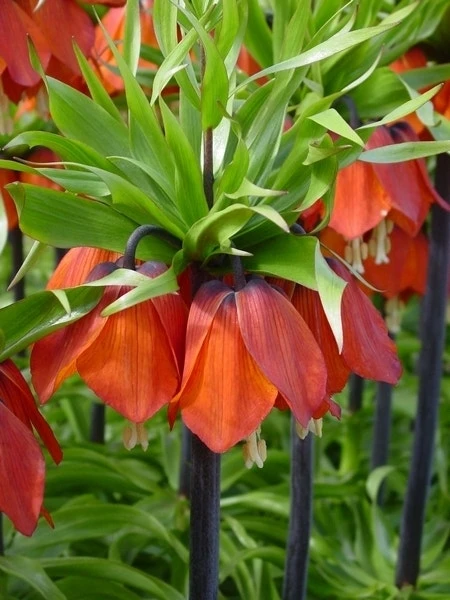 Fritillaria imperialis ‘Rubra’ ook wel rode keizerskroon genoemd, krijgt mooie oranjerode klokvormige hangende bloemen. Het is aan te raden de bloembol zo snel mogelijk in de grond aan te planten, zodat de bol niet verdroogd.