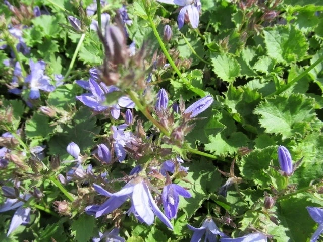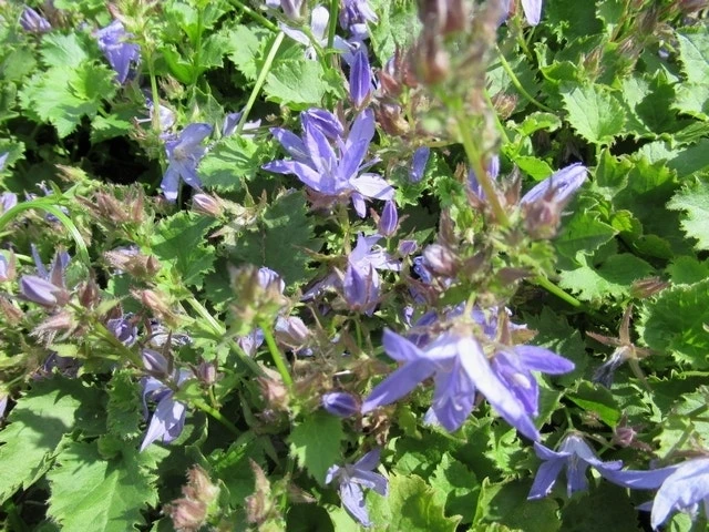 Campanula poscharskyana ‘Blauranke”(Klokje) heeft eivormige bladeren en iets langwerpig, de vermeerdering kan met zaad maar ook via de wortels.
