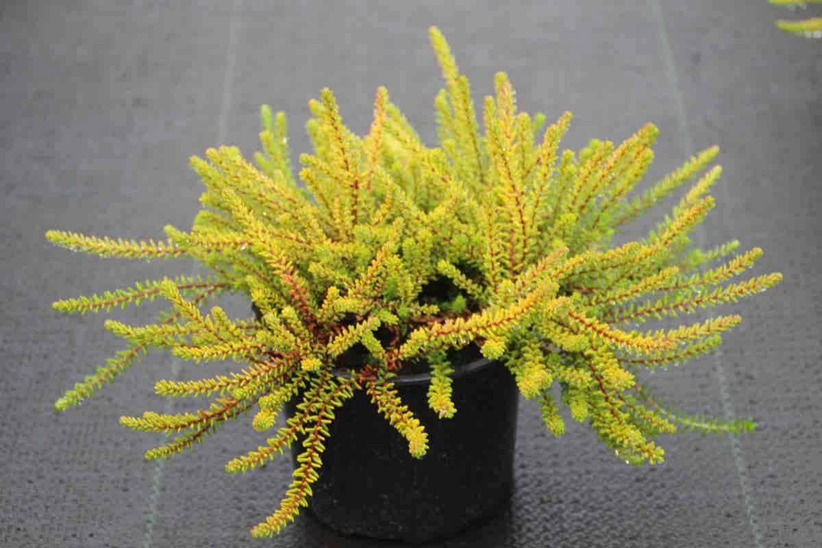 Kraaiheide geel (Empetrum nigrum ‘Bernstein’) is een noordelijke verwant van de heidefamilie. bloeit in het vroege voorjaar en geeft gedurende de winter een prachtige schakering aan geel-rood-gouden verkleuringen. Zeer winterhard en verdraagt ook meer schaduw dan de meeste heideplanten. Zeer geschikt als contrastplant in de heidetuin.