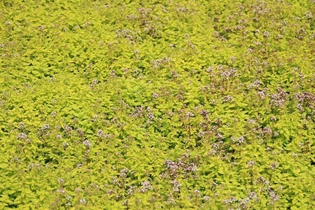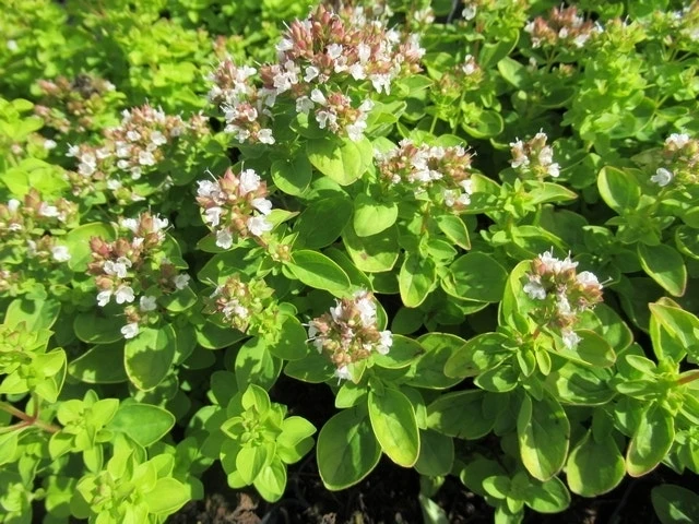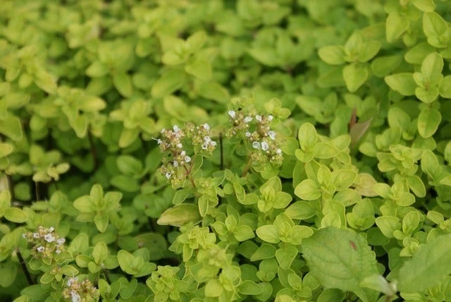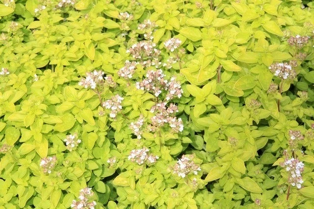 Origanum vulgare ‘Thumble’s Variety’ (Marjolein) is een geelbladige origanum. De bloemen van deze marjolein zijn bleekroze van kleur.