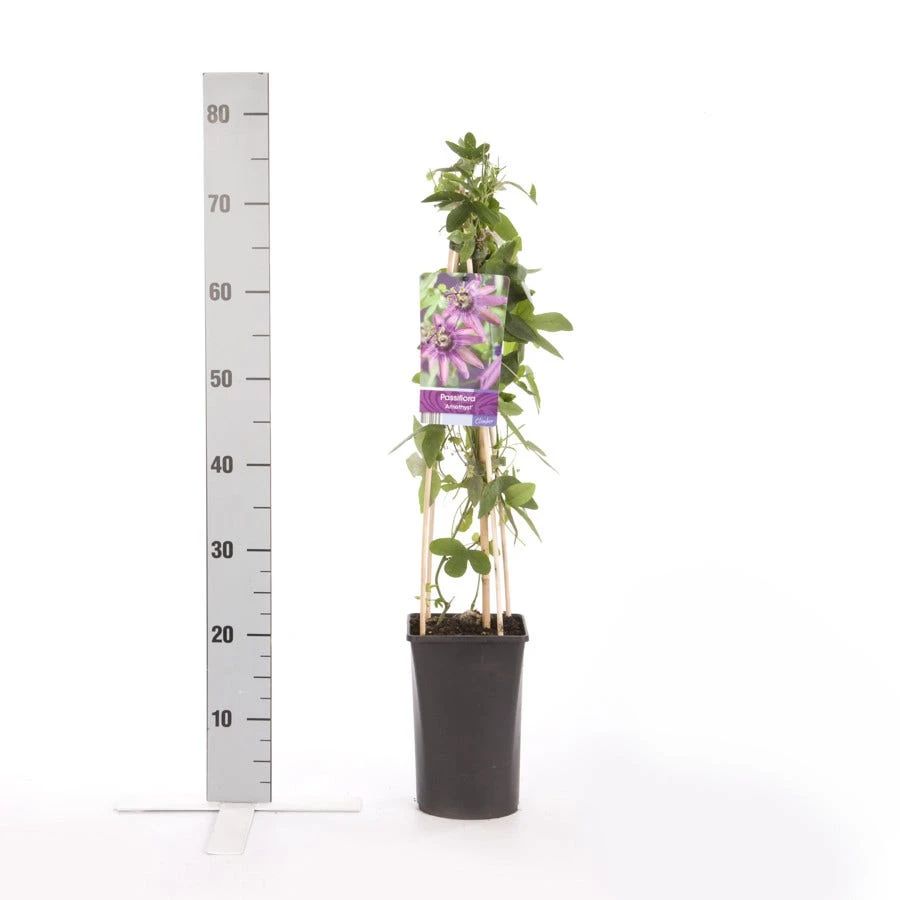 Passiebloem (Passiflora ‘Amethyst’) is een klimplant met prachtige bloemen, de Passiebloem Amethyst heeft een paarse bloem, met paarse kroon en geel/groene stampers. De Passiebloem Amethyst is, net als andere soorten uit de Passiflora familie, een goede klimmer die met de jonge scheuten zich om de leidraad, pergola, of takken van andere planten wikkelt en zich na voldoende houvast met grotere scheuten om deze houvast hecht. De Passiebloem Amethyst heeft een standplaats nodig met volop zon, en zal zijn zonnige plek belonen met een uitbundige bloei. De passiebloem kan tot 3 meter hoog worden. Bij gebruik langs een schutting of andere afscheiding is het aan te raden 3 planten per strekkende meter te gebruiken om een mooi vol resultaat te bereiken. De Passiebloem (Passiflora ‘Amethyst’) is zeer matig winterhard, en kan alleen bij temperaturen tot -1 graad Celsius invriezen voorkomen. Het kan gebeuren dat bij lagere temperaturen de plant tot dicht boven de grond invriest. De wortels zullen echter pas bij strenge- tot zeer strenge vorst kunnen invriezen. Dit kunt u voorkomen door bij vorst de grond om de plant af te dekken. De Passiebloem Amethyst is echter een goede groeier, en zal snel weer mooi in bloei staan.