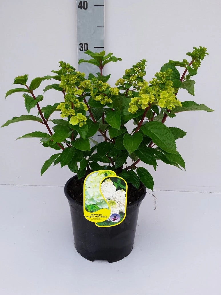 Pluimhortensia (Hydrangea paniculata ‘Magical Mont Blanc’) extra compacte pluimhortensia (70 – 90cm), dus stevigere stengels en dus minder kwetsbaar met slechte weersomdstandigheden. Hydrangea paniculata ‘Magical Mont Blanc’ heeft extra grote, gevulde witte bloempluimen, die richting het einde van de zomer mooi verkleuren in rozerode tinten.