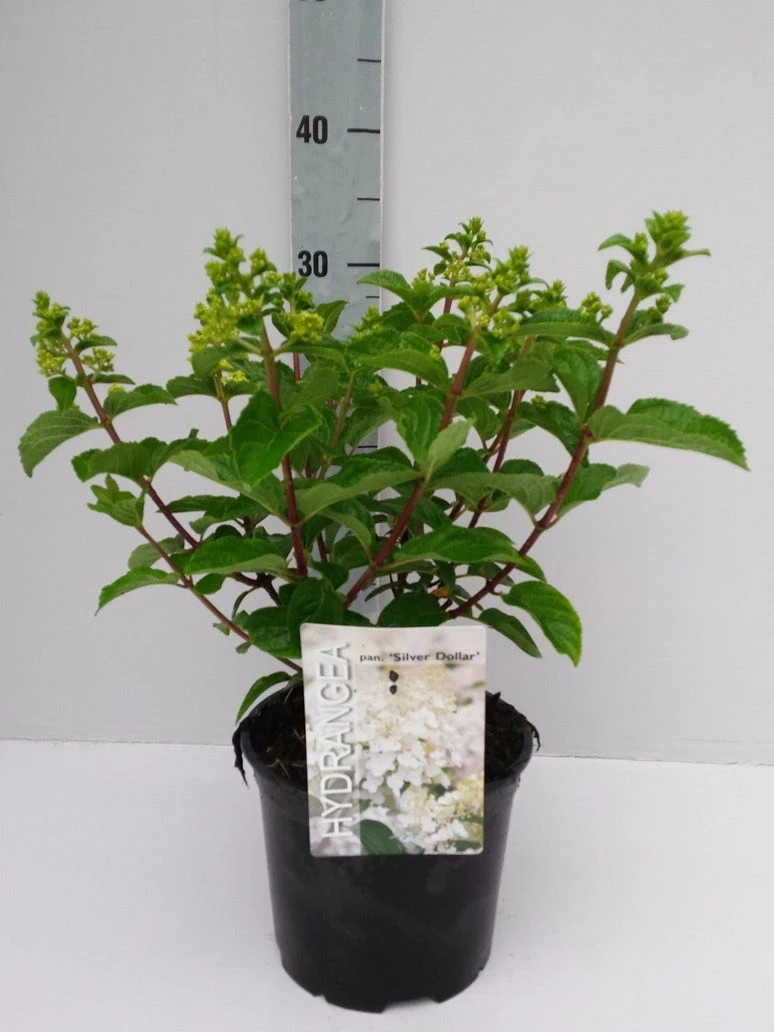 Pluimhortensia (Hydrangea paniculata ‘Silver Dollar’) is een krachtig groeiende pluimhortensia, rijk bloeiend met lossige zilverwitte bloempluimen. De bloemen verkleuren later in het jaar wel via licht roze kleuren naar bruin in de winter. De bloemen hebben in de winter ook nog sierwaarde als silhouet. Geschikt voor zonnige en halfzonnige standplaats.