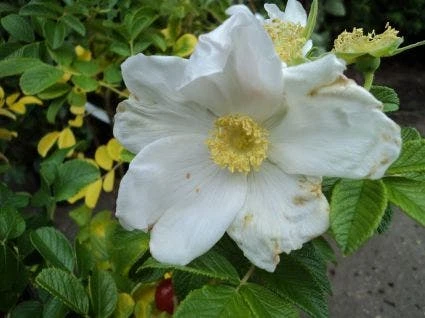 Rosa rugosa ‘Alba’, bloeit van mei tot september, soms tot eind november. De bloemen zijn tot 10 cm groot met een gouden hart, enkel en zuiver wit met overlappende blaadjes. Geurend. De donkergroene bladeren vertonen een mooie, goudgele herfstkleur en zitten aan stevige takken met kleine stekels. De oude takken worden best regelmatig teruggesnoeid. Rosa rugosa ‘Alba’ is een schitterende roos met een opvallende uitstraling die nog versterkt wordt door de helderrode bottels en de fraaien herfsttint.