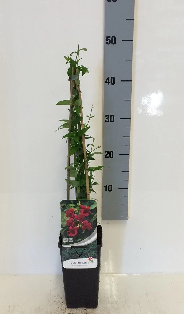 Rode Jasmijn (Jasminum beesianum) is klimmende jasmijn met een purper-roze-rode bloem. Lijkt uiterlijk wat op toscaanse jasmijn, maar is bladverliezend. Is redelijk winterhard maar een zonnige en beschutte plek wordt wel aangeraden om de plant goed tot z’n recht te laten komen. Snoeien na de bloei.