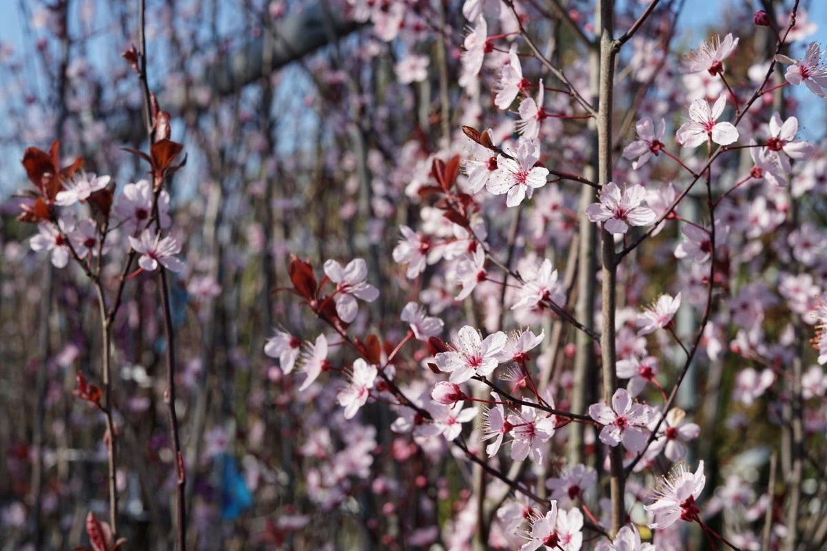 Prunus cerasifera ‘Nigra’ krijgt in het vroege voorjaar, voordat het blad uitloopt, roze bloemen die later naar wit verkleuren.