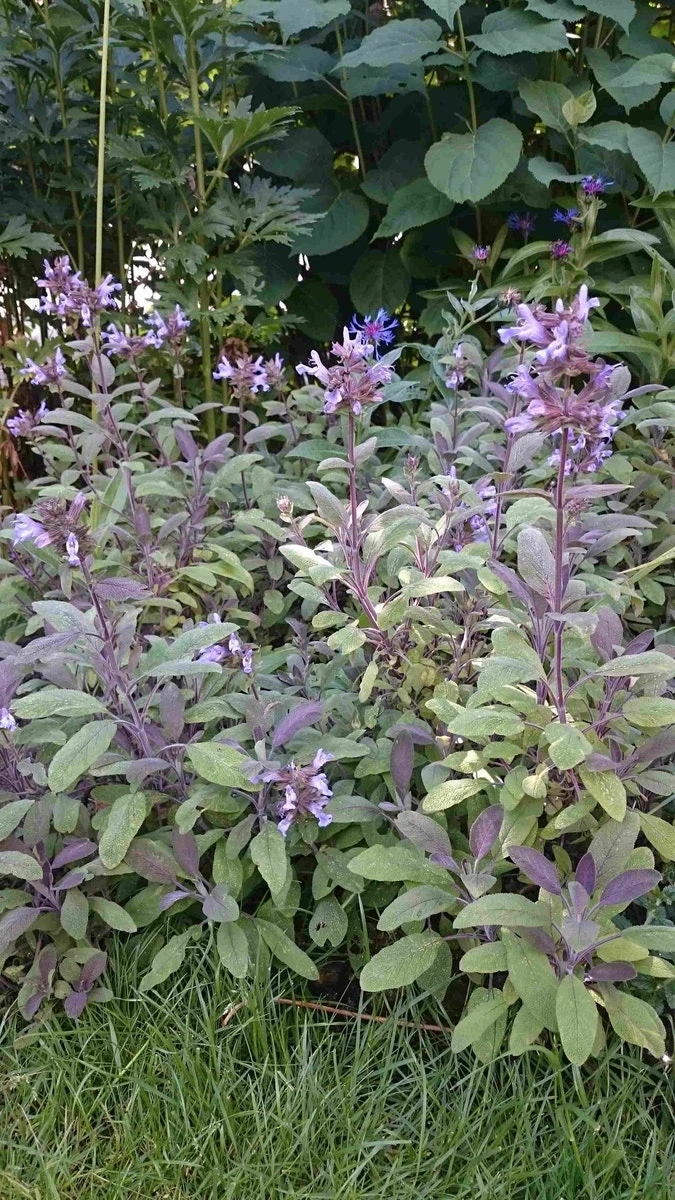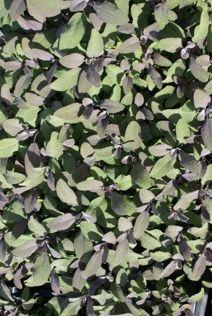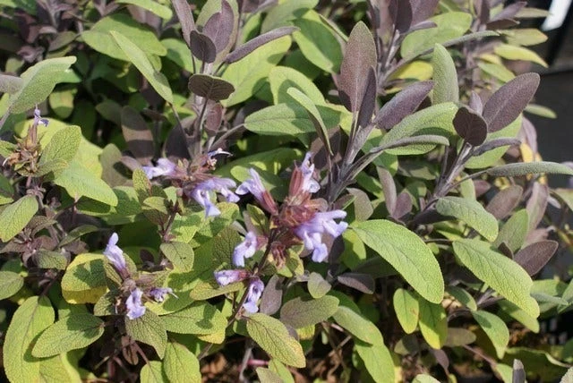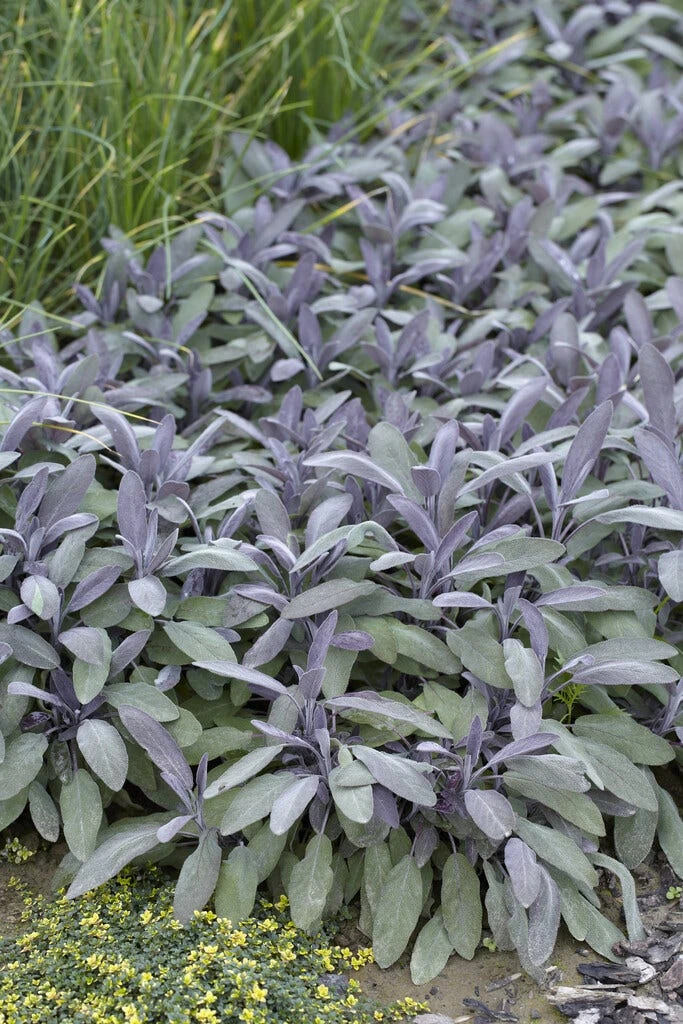 Salvia officinalis ‘Purpurascens’ (Salie) is een aromatische groenblijvende plant met violetpurper getinte bladeren en stengels. Hoogte tot 50 cm. Blad ovaal en paarspurper gekleurd. Blauwe bloemen in aren, juni – augustus. Zon. In het voorjaar snoeien. Verdraagt droogte. Matig winterhard.De Salvia officinalis ‘Purpurascens krijgt blauwe, aarvormige, bloemen in juni – augustus en staat het liefst op een zonnige plek. Thee van het blad helpt bij keelpijn.