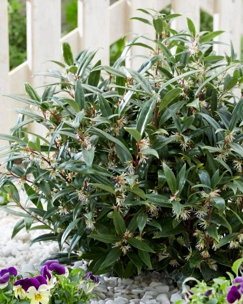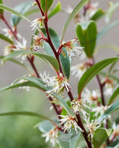 Sarcococca (Sarcococca hookeriana ‘Purple Gem’) is een bossig klein struikje dat opvalt door de vroege bloei en de heerlijke geur van de bloemen. De stelen zijn paarsrood, het blad is glanzend donkergroen. Na de bloei volgen rode bessen die rijpen naar zwart.