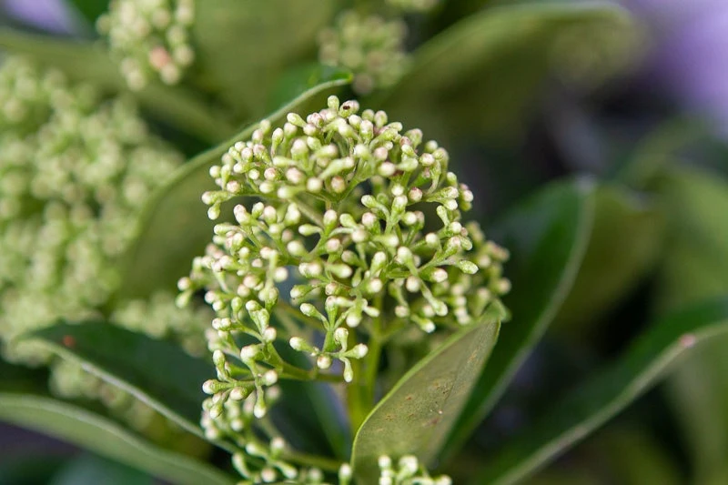 Skimmia ‘White Globe’ groeit compact en is ook erg geschikt voor in een pot.