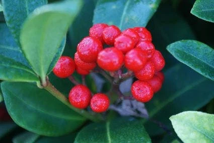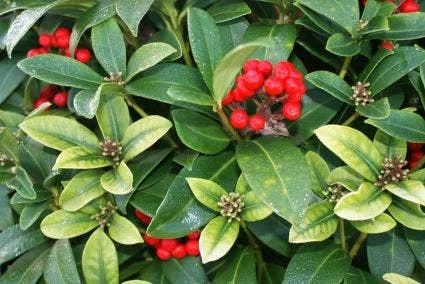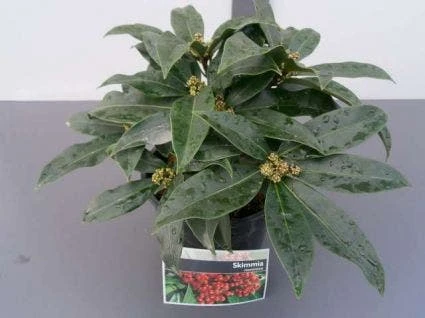 Deze Skimmia wordt in het najaar zeer veel aangeboden in tuincentra.
