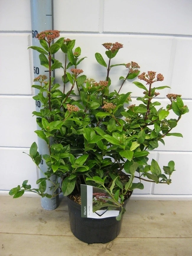 Viburnum tinus wordt ook wel lauriersneeuwbal genoemd.