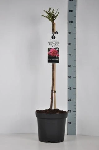 Rosa ‘Leonardo da Vinci’ gekweekt als stamroos heeft donkerroze, gevulde bloemen die ongeveer 10cm in diameter zijn. De zachtgeurende, romantische bloemen zijn regenvast en hebben in het bloemhart de vorm van een vierdelige rosette. Zeer gezond blad.