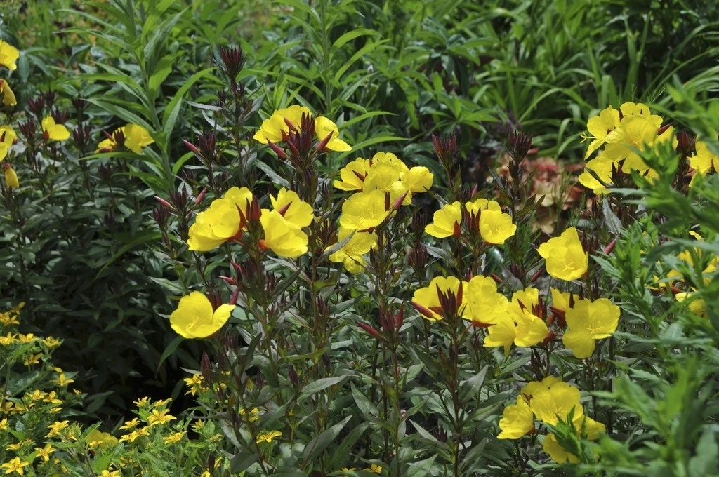 Oenothera fruticosa ‘Sonnenwende’ Teunisbloem is een rijk en langdurig bloeiende planten. Aanplanten op voedzame, doorlatende grond. Knoppen rood.
