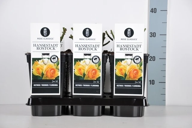 Rosa ‘Hansestadt Rostock’ (trosroos) is een roos met grote, gevulde abrikoos gele bloemen met een diameter van ongeveer 8cm. De roos wordt ongeveer 70cm hoog en 40cm breed. Mooi gezond blad. De roos wordt geleverd in een vierkante pot van 3 liter.