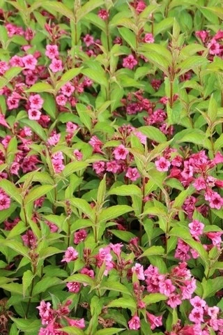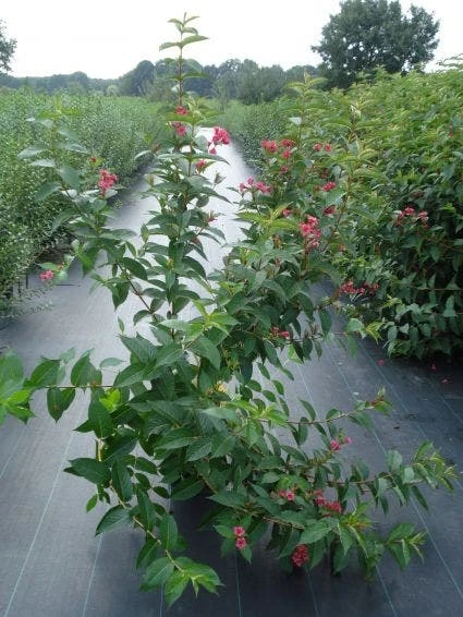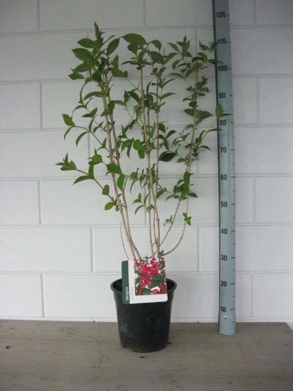 De Weigela staat graag in de volle zon en zal op de plek uitbundig bloeien met dieprode bloemen.